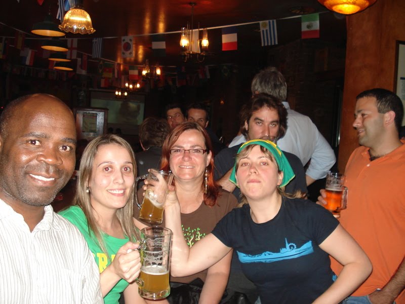 Tive a impressão que apenas eu, a brasileira, e os dois amigos estavam torcendo para o Brasil. O Flanagans inteiro gritou muito com o gol da Coréia do Norte. O fraco desempenho do Brasil rendeu piadinhas no dia seguinte. Mas o importante é que ganhamos a primeira partida. Vamos ver como será o segundo jogo. Eu vou continuar "supporting" daqui com a esperança de assistir mais 6 jogos até o dia 11 de julho de 2010. Vai Brasil!