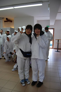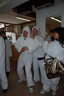 Para não sujarmos nossas roupas dentro da mina, tivemos que vestir essas roupas brancas ridículas.