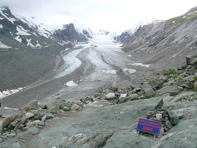 A geleira Pasterze está diminuindo. A placa na foto abaixo indica onde a geleira ficava em 1980. Em apenas 30 anos veja quanta diferença.
