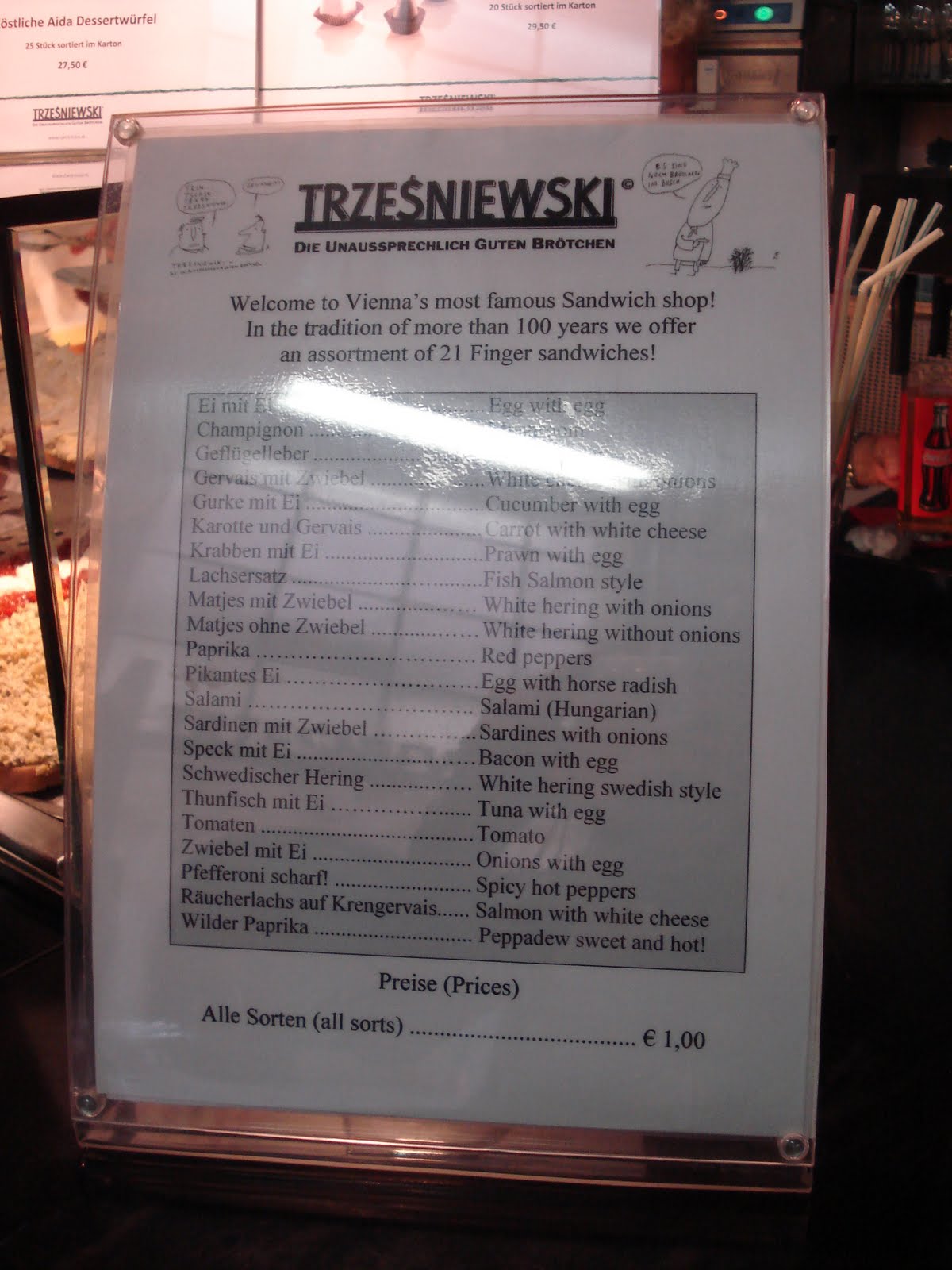 O imigrante polonês Franciszek Trześniewski fundou em 1902 a companhia Trześniewski com receitas originais de cobertura para sanduíches e que até hoje, mesmo depois de um século de existência, são mantidas em segredo. Atualmente existem 8 lojas da rede Trześniewski na cidade de Viena e a mais famosa fica na rua Dorotheergasse 1, pertinho da catedral Stephanplatz.