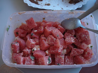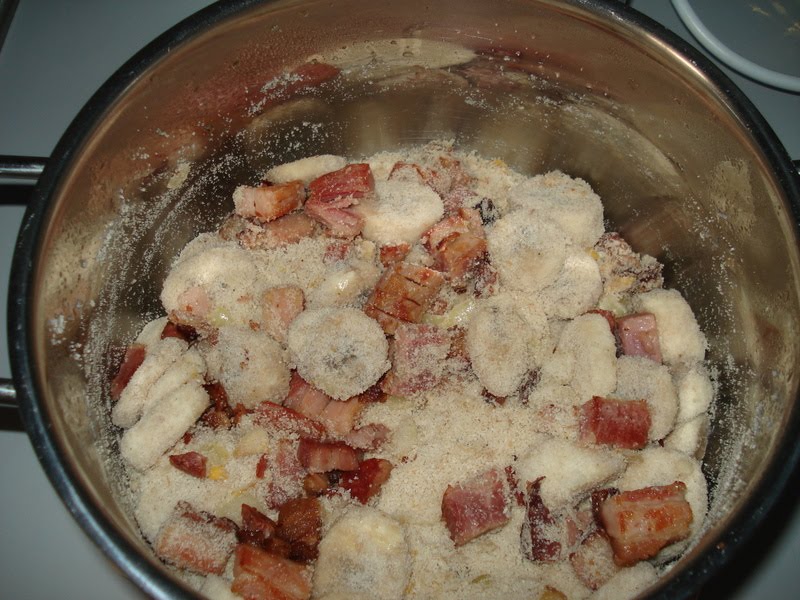 Eu que fiz a farofa de banana com 'bacon'. Acho que gostaram porque não sobrou quase nada!
